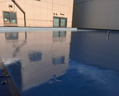 下塗りの乾燥を確認した後、中塗りとして防水機能を担う主材を塗布します。この工程では、塗膜の厚みを意識しながら均一に仕上げることがポイントです。ローラーで端から端まで丁寧に塗り広げることで、耐久性・防水性の土台を築きました。